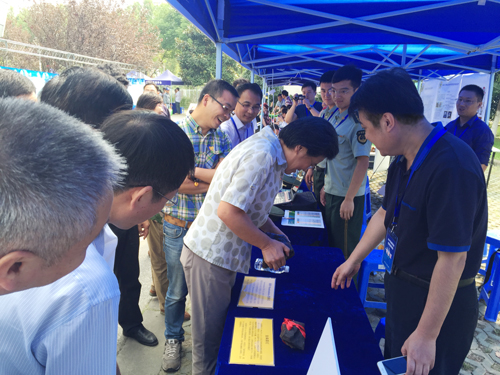 (江苏省科协常务副主席、党组书记陈惠娟来到紫台的展位抱起了一块重约40斤的陨石)