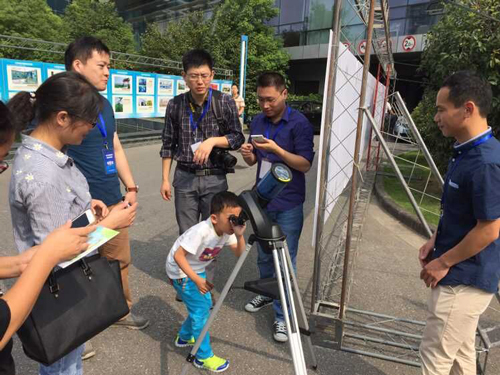 在江苏省青少年科技中心,紫台科普部工作人员和紫台研究生科普小组成员一起,在广场上搭起了科普展位,以陨石展示、望远镜实时观测太阳等内容,向公众展现天文学的魅力,同时还回答了天文爱好者的咨询问题。