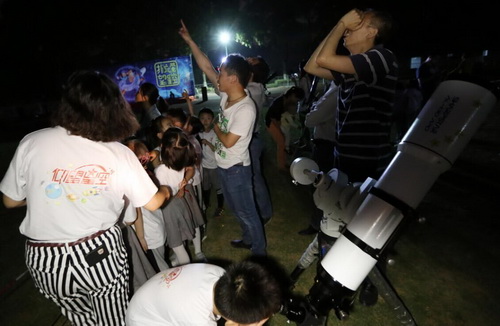 下午三点多,紫台陈向阳、王科超和南京天文爱好者协会的工作人员一起共携带九台望远镜来到南京体育学院的中央体育场选择合适的观星地点。下午四点,一千多名师生和家长在活动场地上陆续“安营扎寨”。当小朋友们在搭帐篷做游戏的时候,紫台和南京天文爱好者协会的人员就已经开始紧张地组装调试几十公斤重的仪器,为观测做准备了。晚上七点多,夕阳西下,距地球7亿公里的木星已经可以透过天幕耀耀可见了。工作人员将各自的望远镜对准木星,木星上的暗色的条文清晰可见,四颗伽利略卫星也点缀在木星周围,此时的木星俨然是天空中最美丽的风景。等候在一旁的小朋友们全都兴奋雀跃,激动不已。在工作人员细心指导帮助下每一位小朋友都通过望远镜观测到了美丽的木星。为缓解他们排队时候的焦急,紫台的和南京天文爱好者的成员们还指导大家抬头认识星空,在老师的指引下,大家从天空中认出了狮子座、双子座,室女座,北斗七星等星座,还了解了不同季节星空变化的特征和原理。除此之外,工作人员现场还教会了大家使用星空软件,帮助孩子们学习星空知识。通过讲解和实际观测,小朋友们学习到了丰富的天文知识。家长表示这样的活动拉近了孩子与家长的距离,也拉近了孩子与自然的距离,仰望星空使他们心胸开阔。观星活动得到了学校、学生和家长的一致好评。