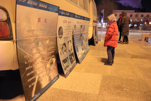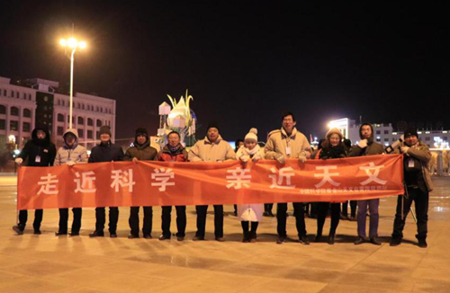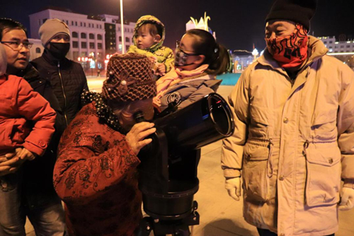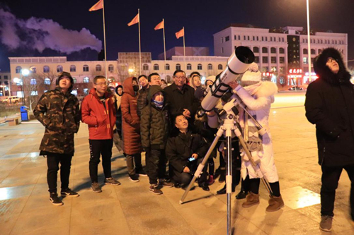 2018年1月31日,青海观测站科普小组负责人李阳组织观测站职工在德令哈市奥运广场给广大群众举办“走进科学,亲近天文”的观“超级蓝血月”科普活动,活动现场准备了三台高级天文科普望远镜以及相关天文知识的展板,每台望远镜都有专人负责为市民们讲解,从使用望远镜观看“蓝血月”、到用手机通过望远镜拍摄“蓝血月”等。前来观超级“蓝血月”的市民在工作人员的引导下井然有序的排队进行观看,好多观看者表示第一次使用专业望远镜观看月亮,都兴奋不已,为了看清楚超级“蓝血月”的变化过程甚至连续多次排队进行观看,陆陆续续接待了百来名观月者。虽然当天晚上室外温度特别低,但是丝毫不影响市民们观看“蓝血月”的热情,都为看这千载难逢的超级“蓝血月”激动不已。活动持续了四个多小时,到晚上十点半大家才恋恋不舍的离去。市民们纷纷表示非常感谢青海观测站举办此次活动,让大家能亲眼目睹这罕见的一刻,也希望以后能有更多的机会参加类似的天文科普活动。