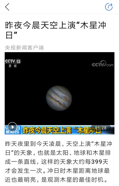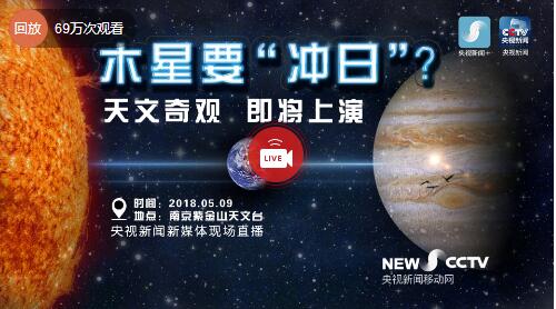 2018年5月9日夜晚,紫金山天文台科普部与南京天文爱好者协会在紫金山科普园区共同举办了“木星冲日”观测摄影活动。中央电视台央视新闻客户端、央视新浪微博对活动进行了网络直播,央视新闻频道CCTV13 晚间新闻、综合频道CCTV1 次日朝闻天下等对活动进行了报道。