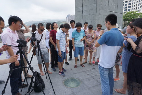 6月19日,紫台与上海台联合工作团队抵达目的地南澳县青澳湾,随即投入到最后的准备工作中。南澳整岛为广东唯一海岛县,青澳湾位于南澳岛东北,东临南海,临海所建北回归线广场和北回归线标志塔,即为本次南澳分会场活动的具体举办地点。南澳岛北回归线标志塔设计精妙,主体部分为架设在空中的象征地球的球体,球体正中有垂直贯通的空洞,在每年夏至日前后的正午时刻,阳光当头直射,恰好可以从空洞穿过,照射在正下方地面上特别设置的玻璃圆盘上,直观显示“此时此刻”阳光直射的现象。