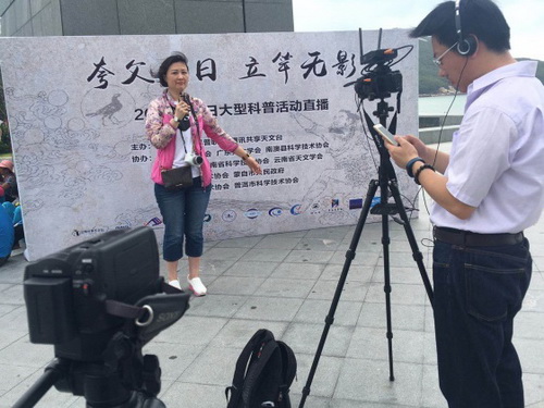 20日中午,趁着当天天气较为晴好,工作团队在北回归线广场的北回归线标志塔下,全程演练了第二天网络直播活动的流程,并利用标志塔成功拍摄了正午前后阳光垂直照射的视频。