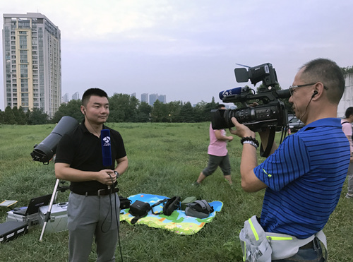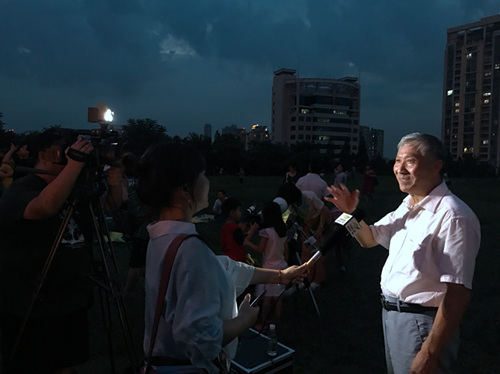 南京的夏夜暑气未散,闷热难耐。夜幕降临后,天空中的云层较厚,现场只能透过一些云层缝隙,展开观测。不过这些都未影响市民的热情,晚上8时起,天气有所好转,月亮和火星蒙着一层面纱从东方升起。通过现场高倍率的望远镜,火星和月球被近距离地呈现在人们眼前,观众在各个望远镜后排起了长龙排队等候参观,紫金山天文台陈向阳、樊莉平、王科超、葛永良、刘炎和南京天文爱好者协会会员一起在望远镜旁指导大家观测,解答媒体记者和公众有关问题。夜色下,大家还利用望远镜对出现在天空中的木星和土星等目标进行了观测。