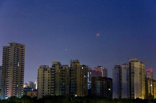 由于本次月全食初亏发生在28日凌晨2点24分,晚上十点以后,现场的大部分市民已经陆续离开,但仍然有一些人准备彻夜奋战,观测接下来的月全食。工作人员也是留下了两架望远镜和观众一起迎接月全食的到来。2点24分,月全食如约而至,月亮缓缓进入到地球的影子当中,最终一轮红月亮和明亮的红色火星相伴悬在南京夜空之中。月食开始后,又有一些市民带着孩子前来观测,询问得知,有好几个孩子是专门设置了闹钟,半夜起来来到现场的,公众对天文的爱好和热情可见一斑。由于本次的月食发生较晚,南京地区只能看到“带食月落”。随着东方的天空逐渐亮起来,火星和红月亮也一起落入了西方的晨曦之中,观测活动圆满结束。