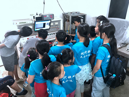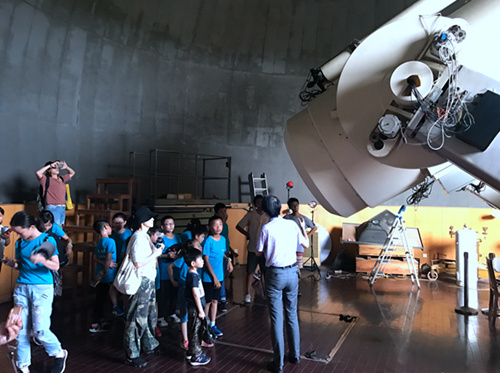 22日,夏令营来到紫金山天文台赣榆观测站。赣榆站观测站坐落在赣榆吴山山脚下,建于上个世纪八十年代,拥有一架口径为26公分的太阳精细结构望远镜,望远镜为赤道式双筒结构。一个筒观测太阳色球,另外一个筒观测太阳光球。周团辉博士告诉小营员们,太阳活动有 11 年的周期性。如果是太阳活动高峰年,太阳表面有很多黑子,就像太阳长了一个个黑痣,太阳活动频繁。近年来是太阳活动的低谷期,日面已经连续 40 多天没有黑子出现了。到2022 年又将迎来太阳活动高峰年,到那时,太阳的表面会出现很多黑子、暗条和耀斑等。正因为太阳对地球的影响很大,科学家们希望可以更近距离地观测太阳,我国科学家正在积极研制我国首颗专用太阳观测卫星——ASO-S,这颗卫星将于2022年上半年择机发射。