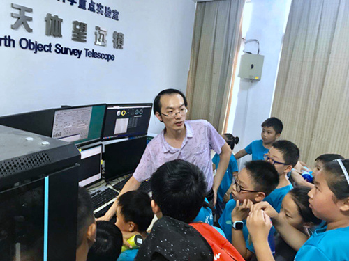 随后,营员们来到紫金山天文台盱眙观测站,在工作人员胡龙飞的带领下参观了1.2米近地天体望远镜和观测室。胡老师介绍了盱眙站的简要历史,以及近地天体望远镜的观测工作原理和小行星预警的重要性。大家对于走进中科院野外台站与科研一线人员零距离接触感到格外兴奋,激起了了解未知世界的极大兴趣。