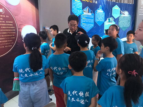 水运仪象台是北宋天文学家苏颂等人发明的一种大型天文仪器,已有900多年的历史,它是集观测天象的浑仪、演示天象的浑象、计量时间的漏刻和报告时刻的机械装置于一体的综合性观测仪器。在按1:5复制的水运仪象台前,姚老师详细介绍了由这台仪器的功能和工作原理。看到设计如此巧妙的仪器,小营员们为中国古代天文学家的聪明才智和创造精神发出阵阵惊叹。