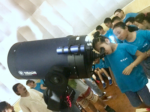 随着夜幕降临,本次活动的另一项重头戏——天文观测开始了。盱眙站优良的天文观测条件让久居大城市的孩子们因为看见满天的繁星而兴奋不已。工作人员在观测现场准备了三台天文望远镜,引导大家有序地排队观看月亮、土星、火星、木星及其卫星。活动的参与者几乎都是第一次通过天文望远镜观测天体,透过望远镜,月亮仿佛瞬间被拉近了几十倍,月球上的山地、月海以及大大小小的被撞击形成的环形山、辐射条纹清晰可见。土星光环、木星上那漂亮的条纹和著名的伽利略卫星引发了大家的阵阵惊叹声。