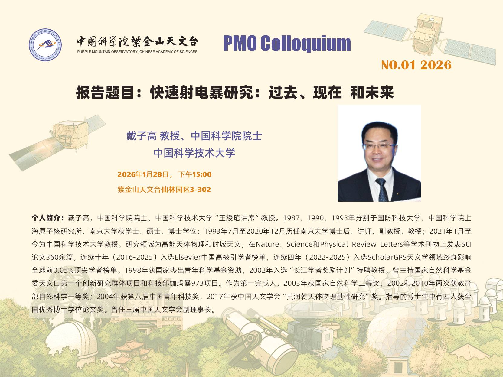 报告摘要:快速射电暴是持续时标为毫秒量级的、辐射频率为千兆赫兹的射电爆发现象,也是高能时域天文学的前沿研究领域。从2007年发现以来,天文学家一直不懈地努力理解这类神秘现象,近几年取得了重要进展,包括已经观测到800多个快速射电暴源,其中约60个为重复暴源。本报告将深入浅出地介绍快速射电暴的研究历史和重要进展,并展望该领域的前景。