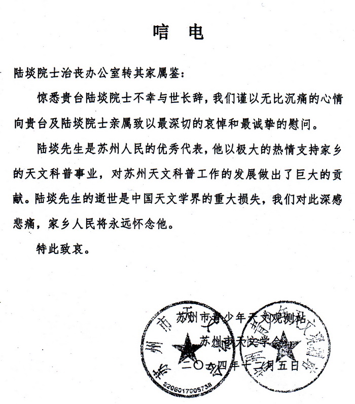 苏州市青少年天文站观测站、苏州市天文学会唁电