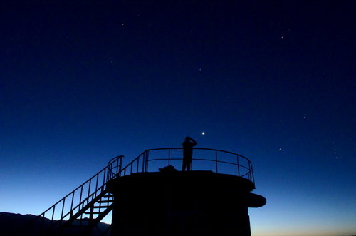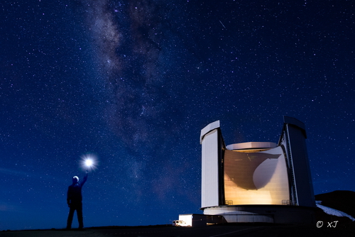 照片描述:该图为作者自拍,摄于夏威夷大岛冒纳凯亚火山山顶。图中右侧为 JCMT 望远镜,世界上口径最大的亚毫米波望远镜,于2015年开始由东亚天文台(中国、日本、韩国联合机构)接管之后,我国的天文学家积极地使用该望远镜进行了大量亚毫米波前沿科学研究。此片为作者在 JCMT 望远镜进行科学观测值守期间拍下:一个科研工作者与宏伟的银河、壮观的望远镜合影,这既是对浩瀚宇宙的致敬,也表达了探索宇宙的坚定。