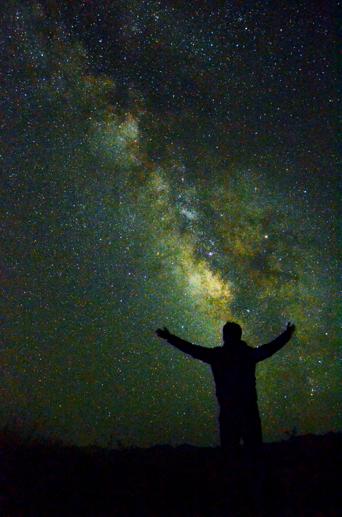 照片为在草原上拍摄到的人马座方向银河。由于银心的存在,该部分银河为目视银河中最为壮观的一段,内有大量的星云,比如著名的礁湖星云,三叶星云等。从照片中可以看到由于大量尘埃的遮挡,使得银河在此处分叉,中间的暗带正是银道尘埃。银河下的蒙古包构成了一副人与自然的和谐画面。