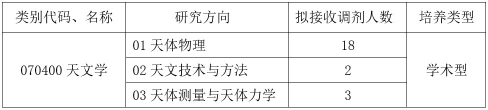 2026年中国科学技术大学天文与空间科学学院(紫金山天文台,以下简称“紫台”)拟接收部分学术型硕士调剂生,为保障调剂工作规范、有序开展,结合教育部、中国科学技术大学 2026年硕士研究生招生调剂相关政策及紫台人才培养需求,现将调剂相关事宜公告如下: