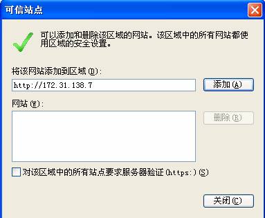 3、 单击“站点”弹出下一个窗口,在地址栏中输入http://172.31.138.7 然后单击“添加”。(注意,添加前将含有https:的那行文字前的勾取消);