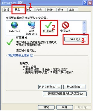 1、IE浏览器点“工具”-“Internet选项”-打开对话框后,点击“安全”标签,选中“可信站点”图标,再点击“站点”按钮,打开“可信站点”对话框