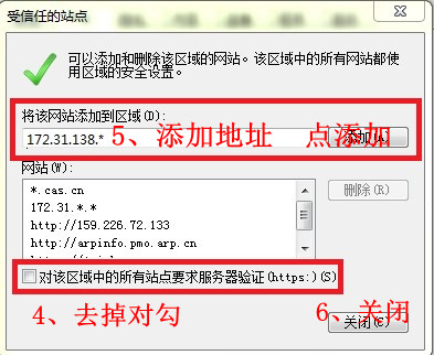 3、在“将该网站添加到区域”下的文本框中输入以下地网站地址,添加到“网站”列表中,添加后点“关闭”关闭对话框: