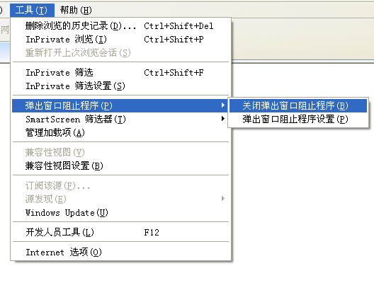 6、在菜单栏点“工具”选择“弹出窗口阻止程序”,点“关闭弹出窗口阻止程序”