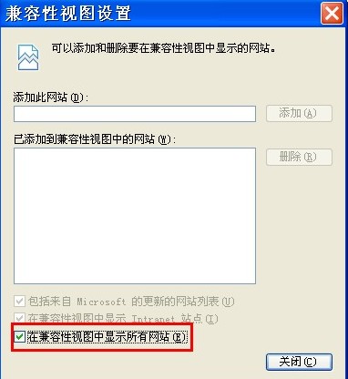 7、在菜单栏点“工具”选择“兼容性视图设置”,将“在兼容性视图中显示所有网站”前的复选框选中后,关闭该对话框