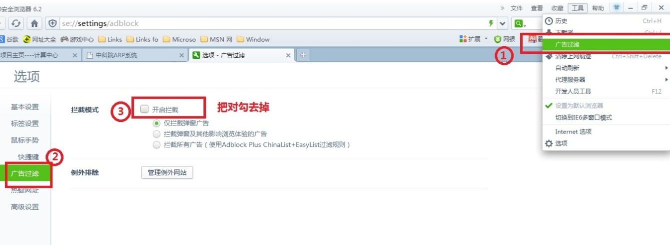 点“工具”-“广告过滤”,取消弹出窗口拦截