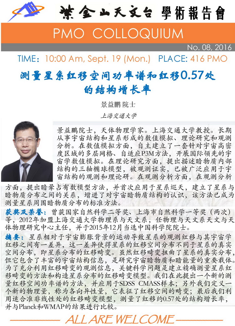 9月19日 PMO Colloquium:测量星系红移空间功率谱和红移0.57处的结构增长率