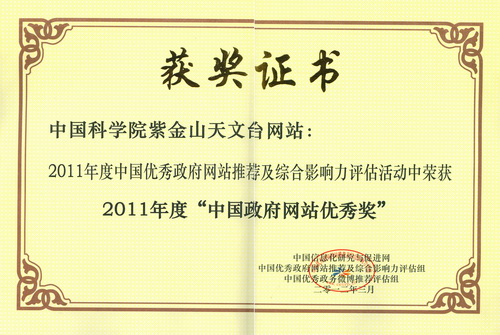 据中科院网站报道(http://www.cas.cn/xw/yxdt/201112/t20111226_3417373.shtml):2011年12月25日,2011年度中国政府网站推荐及综合影响力评估结果正式公布,中科院紫金山天文台网站荣获2011年度“中国政府网站优秀奖”,此外,中科院网站荣获“政府网站优秀奖”和“快速发展型政府网站奖”,中科院心理研究所和大连化学物理研究所也获得“政府网站优秀奖”。