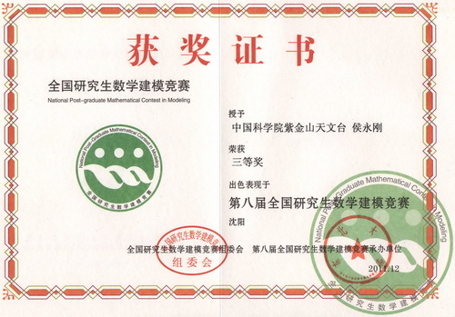 2011年9月25日至28日,紫金山天文台研究生侯永刚、林厚源、朱听雷参加全国研究生数学建模竞赛,并最终在12 月的评奖中获得全国三等奖。