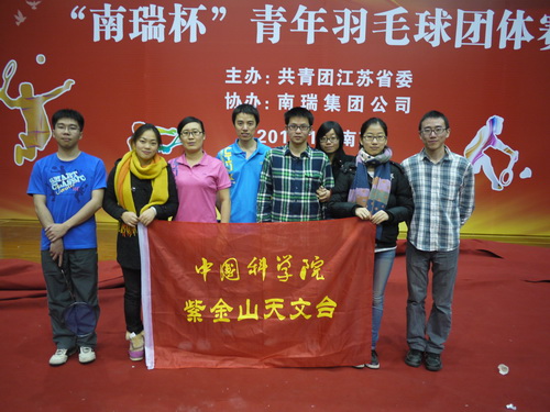 12月1日,在绵绵的秋雨中,由共青团江苏省委举办的省部属企业、科研院所,省直机关、单位,省注册会计师行业——“南瑞杯”青年羽毛球团体赛开赛。紫金山天文台徐晓燕、周鑫、朱听雷、叶嘉辉、高宇翔参加比赛。