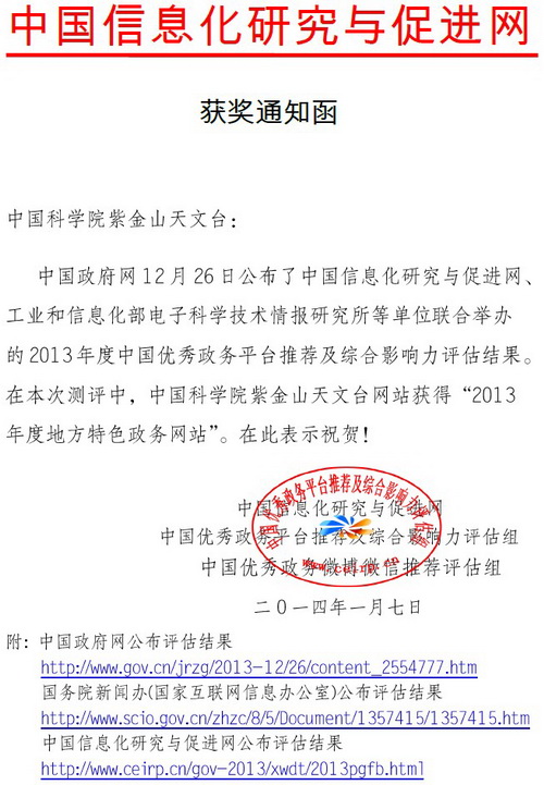 2013年12月26日,2013年中国优秀政务平台推荐及综合影响力评估结果正式公布,紫台门户网站荣获2013年度中国创新型政务平台地方特色政务网站奖。2013年度中科院系统还有院网站和大连化学物理研究所网站获奖。