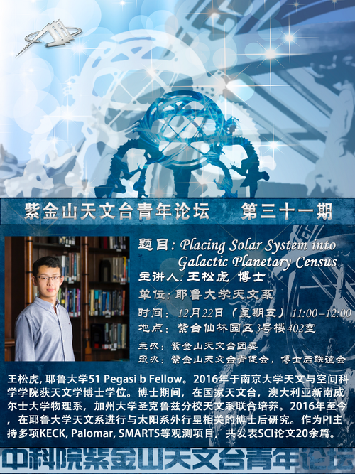 报告人简介:王松虎, 耶鲁大学51 Pegasi b Fellow。2016年毕业于南京大学天文与空间科学学院,获天文学博士学位。博士期间,在国家天文台,澳大利亚新南威尔士大学物理系,加州大学圣克鲁兹分校天文系联合培养。2016年至今,在耶鲁大学天文系进行与太阳系外行星相关的博士后研究。作为PI主持多项KECK, Palomar, SMARTS等观测项目,共发表SCI论文20余篇。