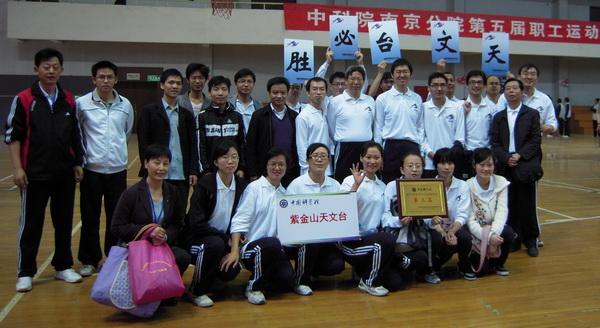 金秋十月,中科院南京分院第五届职工运动会拉开帷幕。紫金山天文台代表队由常务副台长杨戟担当领队,率领50多名职工参加了比赛。全体运动员精神饱满,参加了集体跳绳、拔河、25米托球跑、20米两人三足折返跑、飞镖和投篮6个项目的比赛,团体总分位列9个参赛队第三名。