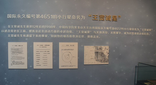 9月20日在宁波帮博物馆一楼特展厅举行了“德厚流光——王宽诚教育基金会三十周年特别展”的开馆仪式。展馆展示了1998年紫金山天文台命名的(4651)王宽诚星的命名铜匾、轨道示意图、轨道运行光盘等历史资料。“王宽诚星”与天地共存,光照寰宇,成为对宽老的永恒纪念。