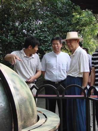 2009年9月11日上午,原中央军委委员、总政治部副主任王瑞林上将(图右一)视察紫金山天文台,南京警备区政委、南京市委常委冯树云、南京军区政治部副主任张玉玺、南京市委副秘书长徐曙海等陪同。我台常务副台长杨戟陪同王瑞林一行视察了紫金山天文台科学科普园区,并向王上将一行介绍了紫台发展概况。