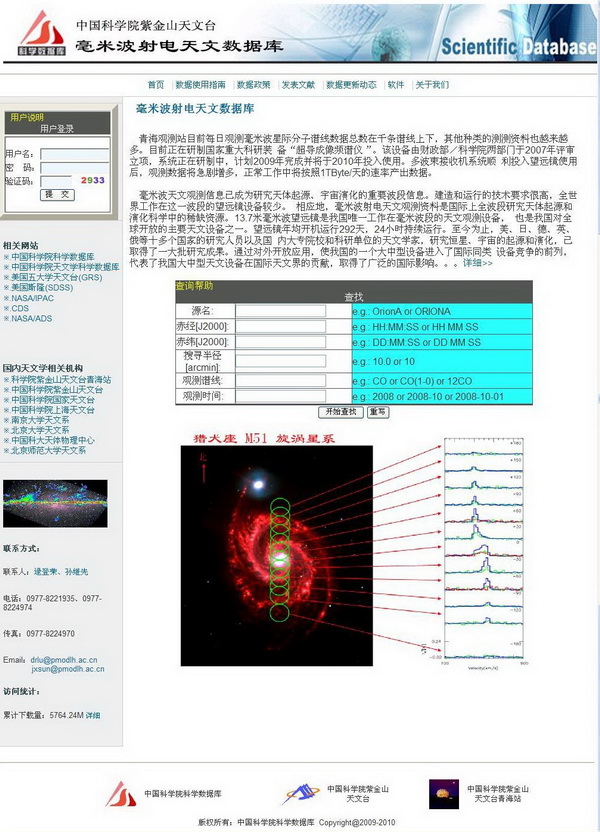 为了提高观测数据的使用效率,实现数据的高度共享,提供各国研究人员使用,提高我国在这一领域的竞争力,紫金山天文台建立了毫米波射电天文数据库。该数据库存储了2003-2009年144万条谱线,谱线数据为通用的fits格式。除跨年度的长期项目外,2009年之前的数据118万条谱线已全部对外开放,所有人都能下载使用。现在,每天观测的数据第二天早晨8:30自动入库,课题观测者可以凭密码登录,下载前一天自己的观测数据。