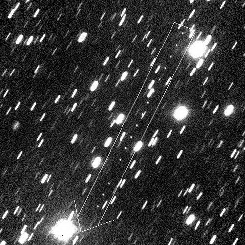 近地天体望远镜拍摄的2011 MD小行星的运动轨迹,其中圆点星象为2011 MD,长条星象为恒星,此图为6月26日北京时间21:03到21:26的15副图像的合并。