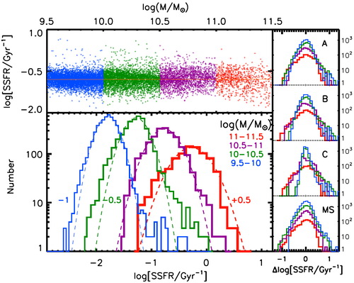 紫金山天文台星系研究团队利用COSMOS大天区深场巡天的多波段数据,对60亿年前(红移0.7处)的活动星系开展大样本统计研究,探索这一时期星系恒星形成活动的规律。这一工作利用stacking技术,结合不同物理模型,首次实现对该红移小质量星系恒星形成率分布的定量估计。如图所示,不论大质量还是小质量的活动星系,它们平均的比恒星形成率(亦即恒星形成率与恒星质量的比值,是衡量星系恒星形成活动相对强度的物理量)相当;发现恒星活动星系“主序”规律的弥散程度随星系的恒星质量变化,小质量处弥散小,大质量处弥散大。这一发现表明,小质量星系中主导恒星形成活动的物理过程比较相似,因而恒星形成率分布弥散小,而大质量的星系形成活动背后的物理过程差异性大,造成恒星形成活动强度分布的弥散大。这一发现是对活动星系“主序”规律的新认识,有助于理解支配星系演化背后的物理规律。