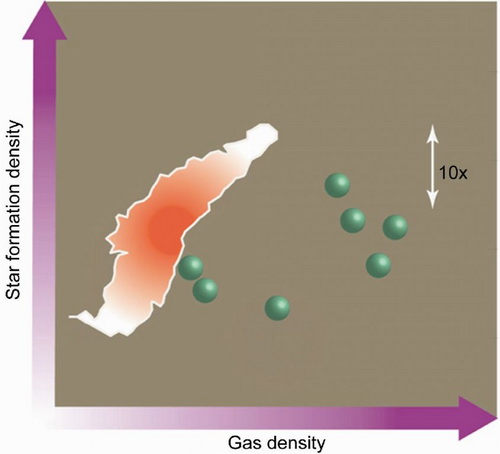 图2: 恒星形成率(单位时间内形成的恒星质量)对气体质量的二维图。橘黄色-白色区域是类银河系在图上的分布,七个绿色的球代表论文中两个星系七个恒星形成区在该图的分布。最右边的双向箭头长度代表了恒星形成率10倍的变化(图由施勇制作和提供)