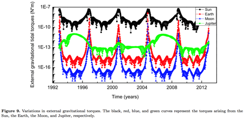 图2 作用于图塔蒂斯小行星的太阳、地球、月球及木星的力矩变化(Zhao et al. 2015,MNRAS)
