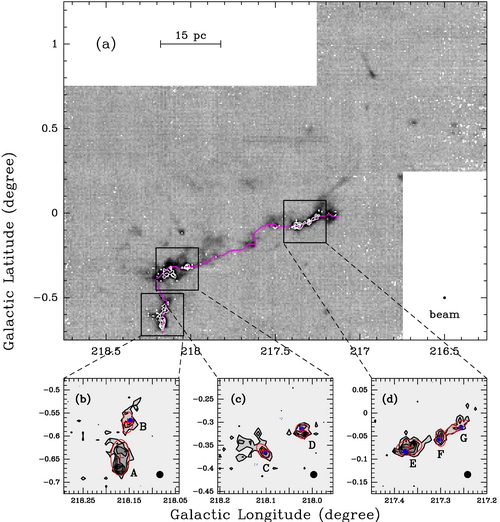 紫金山天文台“银河画卷”计划(http://www.radioast.nsdc.cn/mwisp.php)银道面分子谱线巡天团队在天文与天体物理杂志(Astronomy & Astrophysics)发表最新研究成果,对银道面(216.25°≤l≤218.75°,−0.75°≤b≤1.25°)范围内共约3.75平方度的天区进行了12CO/13CO/C18O(J=1-0)三条同位素谱线同时观测,并结合红外卫星和毫米波尘埃连续谱档案数据研究了其中分子云的物理性质以及与之成协的恒星形成。