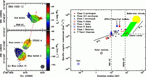 图 1:通过SMA干涉阵CO分子谱线观测得到的SVS13的外流速度结构,揭示了高速“子弹”清晰的旋转结构(左图)。这些旋转的“子弹”所携带的角动量(specific angular momentum)与分子云核相当,远大于星周盘的角动量(右图)。图像摘自Chen et al.(2016)。