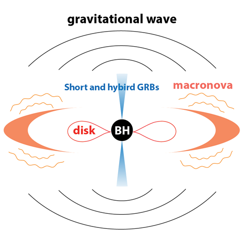 图1. 短暴或长短暴、引力波信号、macronova信号的关联性示意图