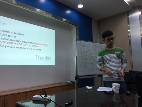 首先,科学新闻播报的环节,杨航同学为大家介绍了最近在超亮X射线源NGC7793 P13中探测到的脉冲信号。他首先简单向听众们介绍了有关超亮X射线源的背景知识,进而简要陈述了两篇文章所进行的同期工作、数据分析,以及得到的结论。通过对之前已有数据的再分析和新观测得到的数据,两组研究人员同时发现了在超亮X射线源NGC7793 P13的光变曲线中存在着一个频率约为2.4Hz的脉冲信号,这一发现证实了P13实为一颗具有强磁场的中子星,从而推翻了此前曾认为其为恒星级黑洞的论断。此外,这还是第二颗被认定为脉冲星的超亮X射线源,对人们进一步了解此类型的天体起到了积极的推动作用。本次Science News引起了到场师生的广泛兴趣和热烈讨论,报告人也表示因此获益良多。(ref: Fürst, F., et al. ApJL, 2016, 831:14; Israel, G. L., et al. arXiv:1609:06538)