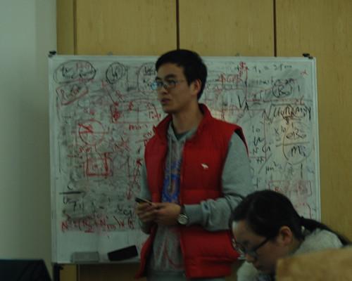 赵起同学为大家做了一场题为"Evidence for delayed massive star formation in the M17 proto-OB association"的报告。红外暗云中包含了很多正在形成的大质量恒星,所以研究红外暗云对于研究研究大质量恒星形成的早期环境非常重要。通过spizer和MSX对M17 SWex中红外暗云的观测数据进行SED拟合发现,M17 SWex中有很多年轻恒星天体(YSO)。仿照初始质量函数对这些YSO构建质量函数,文章发现YSO的斜率比初始质量函数的斜率更陡,经过对比分析发现M17 SWex中缺少按照恒星演化理论应该已经出现的大质量恒星,所以文献中作者认为这是大质量恒星形成延迟的证据。(Reference:Povich, M. & Whitney, B., 2010, ApJL, 714:L285)。报告之后,报告人与听众对红外暗云的性质、大质量恒星形成的条件、初始质量函数的普适性以及与原恒星质量函数的关系等诸多话题展开了广泛的探讨。在相互讨论、尤其是江治波研究员的解释下,大家对于大质量恒星的形成有了更为深刻的认识。