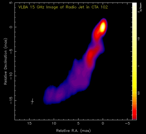 图1. CTA 102的射电喷流(图片来源:http://www.physics.purdue.edu/MOJAVE/)。