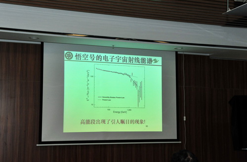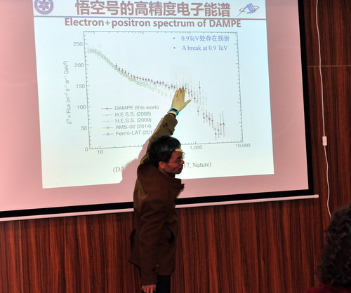 首席科学家常进研究员的“暗物质卫星首批重大科学成果报告”将会议气氛推向顶点。报告从什么是暗物质,为什么要寻找暗物质?如何寻找暗物质?“悟空”卫星都有哪些目标?“悟空”卫星的探测原理是什么?“悟空”卫星的在轨运行状况怎么样?卫星的研制有多难?“悟空”在宇宙中,都“看”到了什么?几个方面作出了精彩阐述,向全体到会人员和隔着屏幕关注报告会的人们展示了令人振奋的结果。“悟空”卫星在轨运行的前530天,共采集到约28亿高能宇宙射线事例。基于这些数据,科研人员成功获得了1万亿电子伏特以上能区国际上最精确的电子宇宙射线探测结果:电子宇宙射线的能量测量准确性最高,与世界上其他的空间项目相比有显著提高,开辟了宇宙观测新窗口;测量到的电子中混入质子数量最少、“纯净”程度最高,能谱准确性高,获得了世界上精度最高的宇宙高能电子能谱;首次直接测量到电子宇宙射线能谱的一处拐折,对于揭示“低能电子宇宙射线是否部分来自于暗物质”起到关键作用;在1.4万亿电子伏特能量处发现电子能谱存在现有理论无法解释的尖峰结构迹象,很可能与暗物质或新奇天体相关,有望通过进一步研究催生重大、开创性科学发现。随后范一中研究员又对成果进行了激情洋溢的解读和评述。