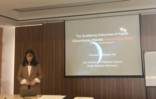 潘梦睿同学为紫台师生作题为“The Scattering Outcomes of Kepler Circumbinary Planets: Planet Mass Ratio”的学术报告。报告主要介绍了行星科学研究中一个重要的课题: Kepler 环双星行星轨道的形成机制. 在介绍该机制前,报告人首先简要介绍了目前 kepler 望远镜发现的环双星行星, 发现它们大多为木星质量. 随后介绍了目前已提出的用于解释该类行星形成的模型, 其中最经典的核吸积模型并不能解释 kepler 望远镜观测到的”高”离心率现象, 2015年Kley & Haghighipour 提出, 系统内可能存在另一颗行星, 两颗行星经历行星间散射后达到现在的位置. 本报告的内容是基于系统内两颗行星的散射, 研究行星质量比对双星行星系统散射结果的影响, 并将结果运用于Kepler-34 及 kepler-413系统. 结果显示, 环双星行星散射结果与行星质量比及行星初始位置有关. 当行星质量比小于某个阈值, 系统内小质量行星比大质量行星更容易被散射出去, 大于该阈值时, 位于内侧的行星更易被散射。此外, Kepler-34 以及 kepler-413系统均可由该机制解释.