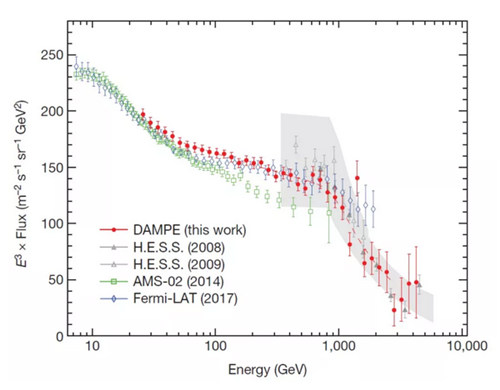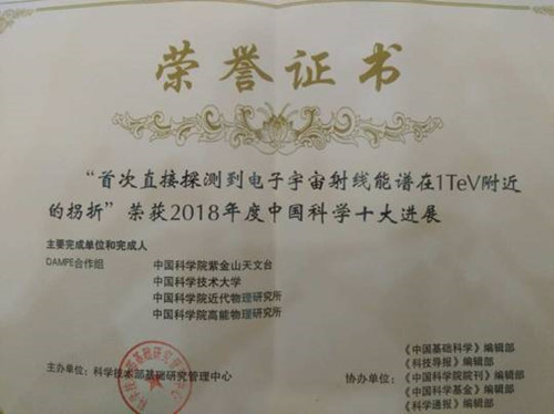 2019年2月27日,由科技部基础研究管理中心举办的第14届“中国科学十大进展”遴选活动结果揭晓。由中国科学院紫金山天文台领导的暗物质粒子探测卫星“悟空”号(DAMPE)科学团队研究成果“首次直接探测到电子宇宙射线能谱在1TeV附近的拐折”成功入选。