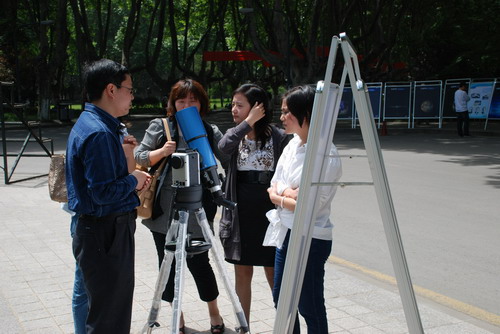 在活动现场,紫金山天文台除了布置内容丰富的天文知识展板,还专门架设了一台小型望远镜,邀请天文专家为师生们讲授天文观测知识,并指导他们进行太阳黑子科普观测,吸引了众多的师生和社会群众积极参与和热烈讨论。扬子晚报、金陵晚报、现代快报、江南时报、南京日报等多家媒体的记者也闻讯赶到活动现场进行了参观和采访。