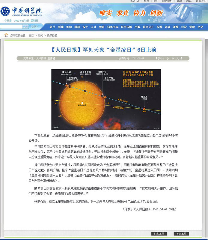 根据中科院紫金山天文台的历算预报,本世纪最后一次金星凌日在北京时间2012年6月6日上午发生。紫金山天文台在本次金星凌日期间开展了视频直播活动,让广大公众通过网络目睹了这一难得的特殊天象,继上个月日环食之后再一次掀起公众关注天文的热潮。