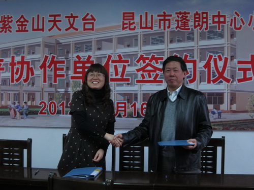 2012年11月16日,正值昆山市蓬朗中心小学校开展天文科普教育30周年之际,紫金山天文台蒋耀文副台长带队前往该校参加庆祝活动,并代表紫金山天文台与该校签订协议,共建科普协作单位。科普部张旸等一同参加庆祝活动,并为该校五年级全体同学举办了一场科普讲座。